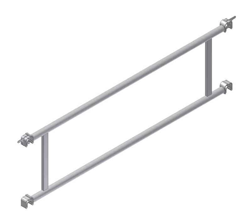 Aufgrund der 2 verschweißten Streben wird das Gerüst-Teil als doppelter Seitenschutz bezeichnet. Der Seitenschutz wird rechts und links angebracht und dient als Sicherung auf der Plattform. Die Streben haben einen 0,50m Abstand zueinander, somit befinden sich der doppelte Seitenschutz im angebrachten Zustand auf Hüft- und Kniehöhe. An den äußeren Enden des Seitenschutzes befinden sich Klauen, diese rasten automatisch ein.