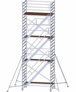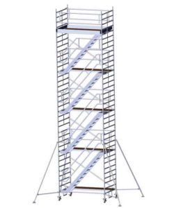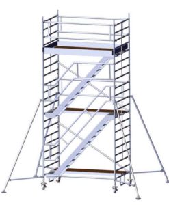Das ALBERT Treppengerüst 7700 kommt ohne Fahrwerk bzw. ohne Fahrbalken aus. Der Treppen-Turm lässt sich komplett ohne Werkzeug aufbauen, sodass 2 Personen vollkommen ausreichen. Bei diesem breiten Treppenturm werden die 200mm Fahrrollen direkt in den Gerüstrahmen gesetzt. Mittels der 3.10 Meter langen Ausleger wird das Gerüst weit nach oben stabilisiert, sodass eine maximale Arbeitshöhe von 14.60 Meter, sprich einer Standhöhe von 12,60 Meter erreicht werden kann. Das Gerüst verfügt über eine Länge von 3 Meter und eine Breite von 1.50 Meter. Eine solch großes Fahrgerüst kommt dort zum Einsatz, wo mit schwerem Gerät gearbeitet wird und sperrige Materialien auch durch den Gerüst-Turm nach oben gelangen müssen. Das Albert Treppengerüst ist im Außenbereich bis zu einer Arbeitshöhe von 8,60 Meter zugelassen. Im Innenbereich kann das Treppengerüst bis zu der Arbeitshöhe von 14.60 Meter ausgereizt werden, sodass hier das Maximum erreicht wird.