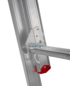 - Der Steckhaken mit Sperrhebel sichert gegen das ungewollte Zusammenschieben der Leiter