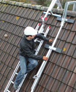 Der Dachausleger kann einfach montiert werden, da er bereits über mehrere Bohrungen verfügt, um den Ständer im richtigen Winkel anzubringen. Mit dem Leiterfirsthaken erfolgt dies auf sichere Wiese, da Sie die Leiter beim Betreten des Dachs hinter den First haken können.
