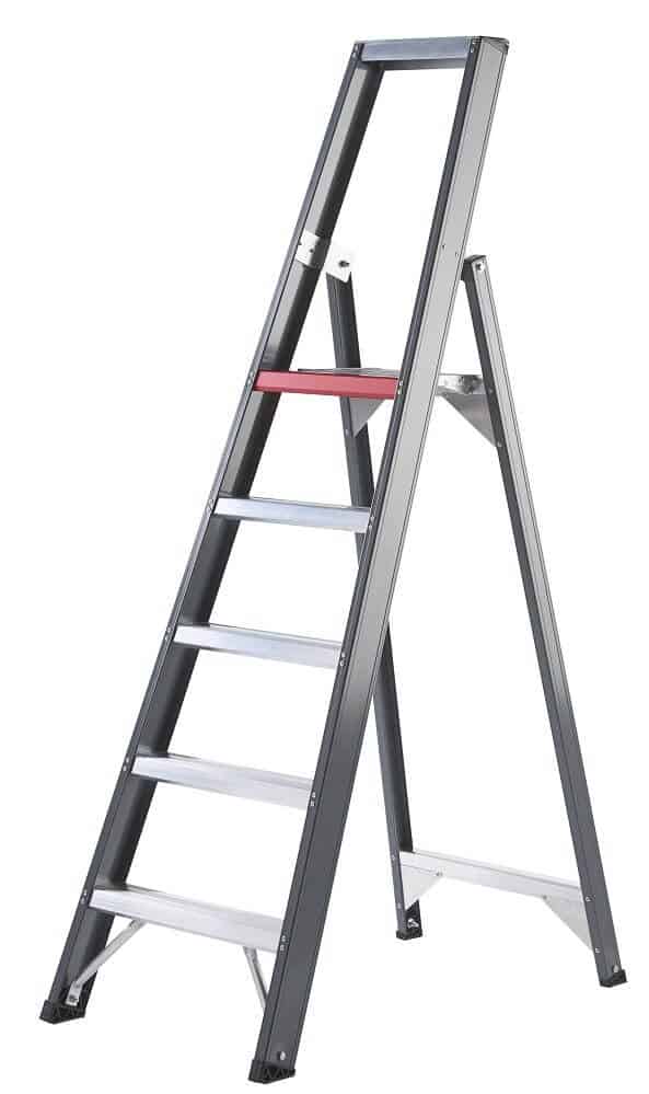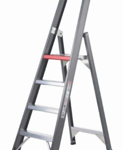 Die einseitig begehbare Stufenstehleiter FALCO des innovativen Herstellers ALTREX aus den Niederlanden bringt Sicherheit in den Arbeitsalltag. Das Modell FALCO (FEO) ist einseitig begehbar und ist in den Größen 3 – 10 Stufen inkl. Plattform erhältlich. Hier hat der Hersteller eine schicke Optik mit einem Plus an Sicherheit und Komfort in Einklang gebracht. Die Holme der Leiter sind mit einer grauen Pulverbeschichtung versehen. Herkömmliche Alu Leitern ohne Pulverbeschichtung können schwarze Hände verursachen. Bei der altrex Stufenstehleiter FALCO bleiben die Hände sauber. Die Leiterholme sind aus einem C-Profil gefertigt – extra breit und sehr robust. Unten angefangen ist die Stufenstehleiter ähnlich wie die Stehleiter TAURUS mit keilförmigen Leiterfüßen ausgestattet. Die Leiterfüße habe eine große Auflagefläche und sorgen für einen besonders sicheren Stand der Leiter. Eine zusätzliche Querverstrebung von erster Stufe und Holm sorgt für mehr Stabilität. Um den Komfort zu erhöhen, hat der Hersteller ALTREX mitgedacht. Die Stufen dieser Leiter sind in einem großen Abstand gewählt und haben abgerundete Kanten. Der große Abstand von Stufe zu Stufe macht das Stehen auf dieser Leiter besonders angenehm für die Schienbeine. Die Plattform der Leiter ist mit einem automatisch entriegelnden Scharnier-System ausgestattet so lässt sich die Leiter unkompliziert Aufstellen und Zusammenklappen. Zusätzlich ist auch die Vorderkante der Plattform rot lackiert. Oben angekommen, sind die Holme durch eine praktische Ablageschale verbunden.Hierbei handelt es sich um eine Stufenstehleiter für den professionellen und dauerhaften Einsatz unter extremen Belastungen.