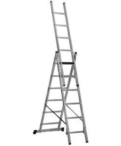 Die Sprossen-Mehrzweckleiter 3-teilig mit Traverse kann als Anlegeleiter, als Stehleiter oder als Stehleiter mit Steckteil verwendet werden.