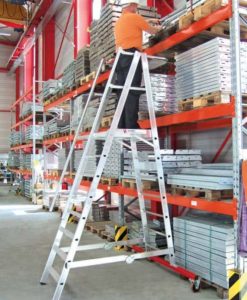 Die Aluminium – Podestleiter klappbar und fahrbar – Nr. 32777 für längere Arbeiten in der Höhe. Optimal für Handwerk, Industrie und Lagerarbeiten.