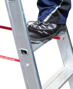 Die Euroline Stufenstehleiter-Alu erkennt der Handwerker sofort am Holmprofil. Die Leiterholme der Premiumline sind strangepresst und mit Sicke versehen. Das macht die Leiter extrem robust und belastbar. Das markante Profil und die roten Leiterfüße sind das Markenzeichen des Premium Herstellers EUROLINE. Hier steckt die Qualität im Detail. Die Beschläge dieser Leiter sind massiv und mit einer Sicherheitsverschraubung (M8) versehen. Gegen ein auseinander Gleiten der Leiterteile kommt hier ein extrem reißfester Sicherheitsspanngurt zum Einsatz und trägt gleichzeitig zur Stabilisierung der Leiter bei. Die Leiterfüße sind fest am Holm montiert. Hier kommt ebenfalls die Sicherheitsverschraubung (M8) zum Einsatz. Die Leiterfüße sind extrem langlebig und die spezielle Gummi/Kunststoff Mischung sorgt für die Rutschsicherheit. Da es sich bei den Leiterfüßen um ein Verschleißteil handelt, können diese dank der Sicherheitsverschraubung problemlos und schnell ausgetauscht werden können. Die Stufen dieser Leiter haben eine Tiefe von 80mm und sind mit einem Stufenabstand von 250mm so verbaut, dass sich eine waagerechte Auftrittsfläche ergibt. Um hier ebenfalls die Arbeitssicherheit zu gewährleisten und dem Unfallschutz vorzubeugen sind die Leiterstufen mit einer Anti-Rutsch-Profilierung versehen. Die Premiumline Stufenstehleiter-Alu von EUROLINE ist im professionellen Einsatzbereich die richtige Wahl für die Handwerker, die beim tagtäglichen Einsatz Wert auf einen sicheren und ermüdungsfreien Stand legen.