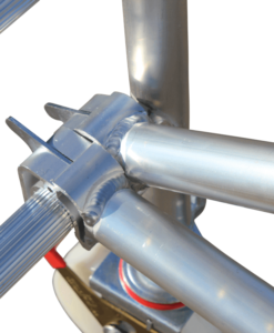 Übrigens wird das Gerüst ohne Werkzeug aufgebaut. Alle Verbindungen werden gesteckt und mit Sicherungssteckern verbunden. Hier steckt die Qualität tatsächlich im Detail und diese Gerüste werden zu 100% made in Germany gefertigt. Die Sicherungsstecker sind übrigens am Rahmen montiert und machen das Suchen überflüssig, da diese so nicht mehr zu verlieren sind. Ein weiteres spezielles Merkmal ist der Fahrbalken dieser Gerüste. Der Fahrbalken ist ebenfalls aus Aluminium gefertigt und hat 6 Rohrverbinder – eine Besonderheit und selten bei anderen Herstellern zu finden, da hier ein seitlicher oder mittiger Aufbau möglich ist. Übrigens die Bordbretter sind sogar aus Aluminium gefertigt und machen ein verdrehen und verwinden, wie üblich bei Holzbrettern unmöglich.