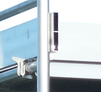 Übrigens wird das Gerüst ohne Werkzeug aufgebaut. Alle Verbindungen werden gesteckt und mit Sicherungssteckern verbunden. Hier steckt die Qualität tatsächlich im Detail und diese Gerüste werden zu 100% made in Germany gefertigt. Die Sicherungsstecker sind übrigens am Rahmen montiert und machen das Suchen überflüssig, da diese so nicht mehr zu verlieren sind. Ein weiteres spezielles Merkmal ist der Fahrbalken dieser Gerüste. Der Fahrbalken ist ebenfalls aus Aluminium gefertigt und hat 6 Rohrverbinder – eine Besonderheit und selten bei anderen Herstellern zu finden, da hier ein seitlicher oder mittiger Aufbau möglich ist. Übrigens die Bordbretter sind sogar aus Aluminium gefertigt und machen ein verdrehen und verwinden, wie üblich bei Holzbrettern unmöglich.