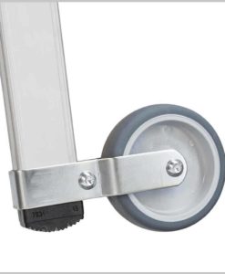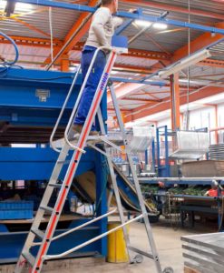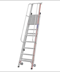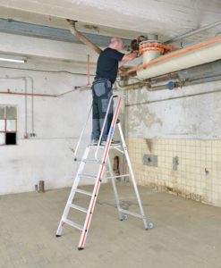 - Speziell für Einsatzbereiche, die eine Verwendung von Podestleitern mit breitem Fahrwerk nicht zulassen oder das dichte Heranfahren an Regale erfordern