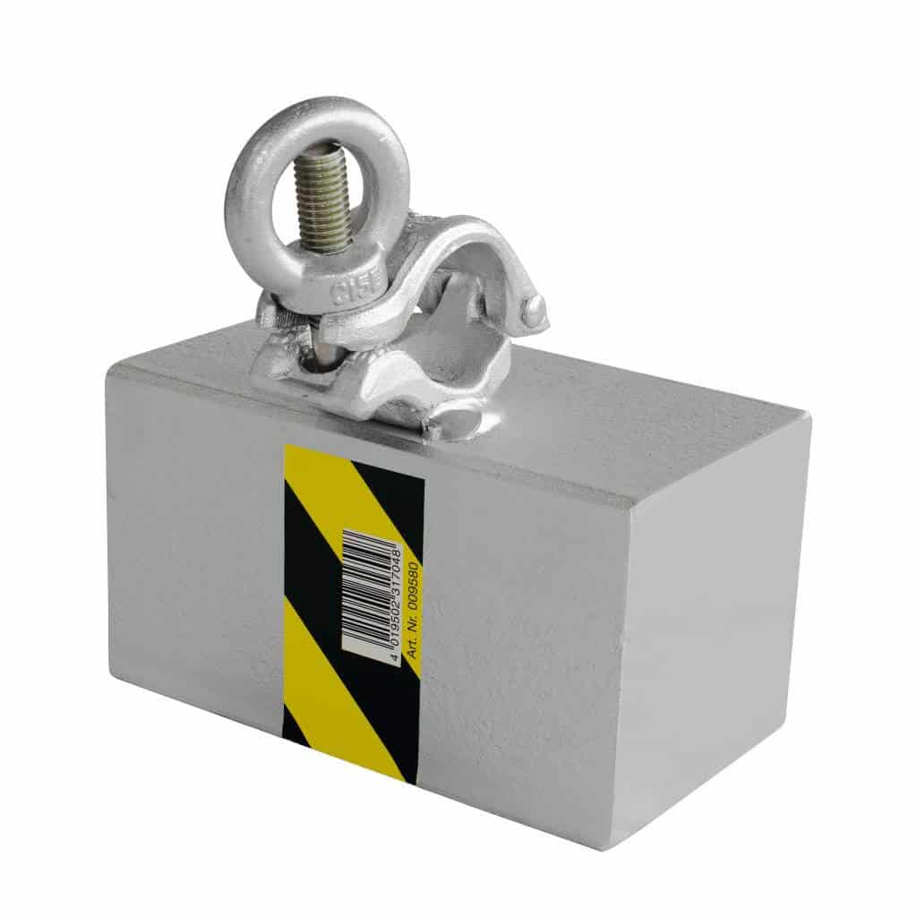 Das HYMER Ballastgewicht ist mit einer Kupplung versehen. Mittels der Kupplung lässt sich das Ballastgewicht schnell und einfach an den Auslegern oder Gerüstrahmen montieren. Der gelb-schwarz gestreifte Aufkleber hat eine Signalwirkung, so lassen sich die Ballastgewichte einfacher am Fahrgerüst finden.