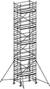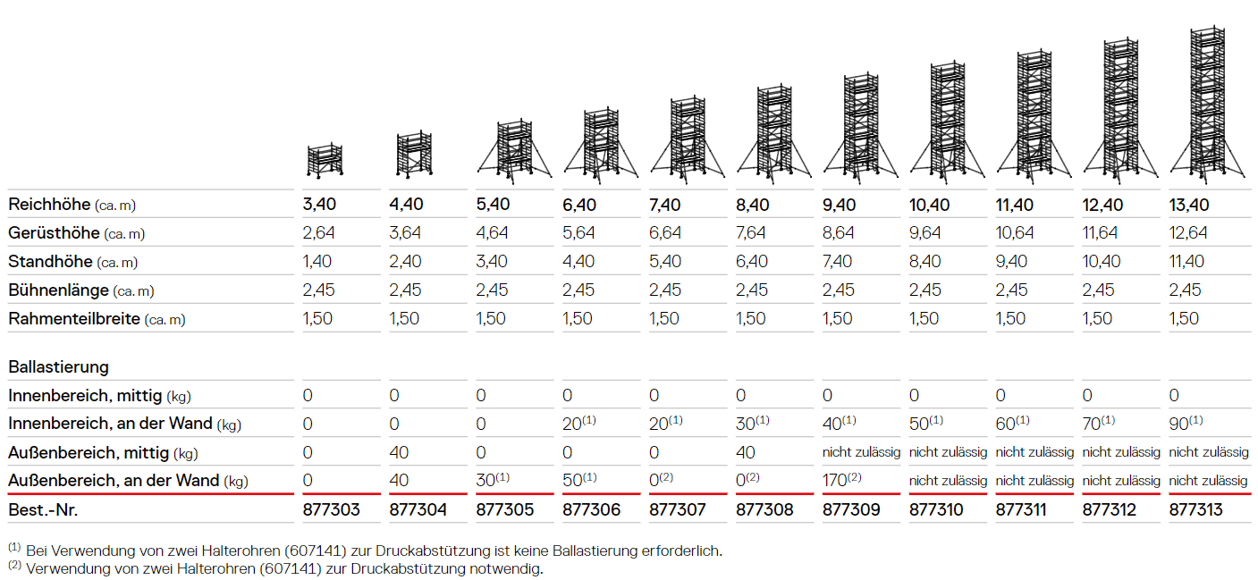 - Hinweis: Jedem Gerüst liegt eine Aufbau- und Gebrauchsanweisung bei, der die erforderliche Anzahl von Zusatzteilen für Wandbefestigung oder Ballastierung zu entnehmen ist.
