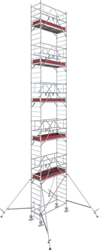 - Das universelle Alu-Fahrgerüst für Arbeiten bis zu einer Arbeitshöhe von 14,30 m (bei Gerüstfeldlänge 2,00 m bis 12,30 m)