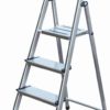 Kompakte Aluminium-Stehleiter mit den nahezu unbegrenzten Ablagemöglichkeiten um ein ständiges Auf- und Absteigen zu vermeiden.