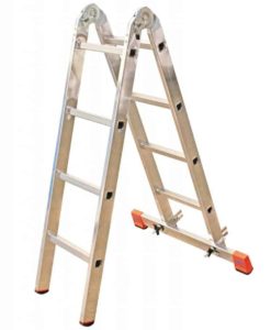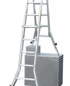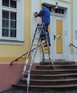 - Einsetzbar als Anlege-, Doppel-Stehleiter und Arbeitsbühne