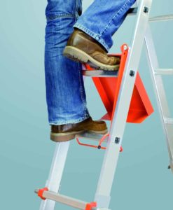Die Plattform ermöglicht bequemes, sicheres Stehen oder dient als Ablage für Eimer und Werkzeuge. (Standfläche ca. 29 x 27 cm) Sie kann in jede Sprosse eingehängt werden und wird zum Übersteigen einfach nach innen geschoben.