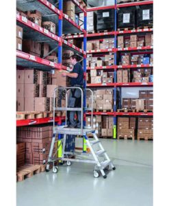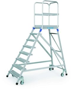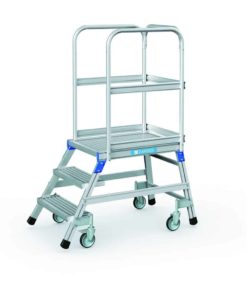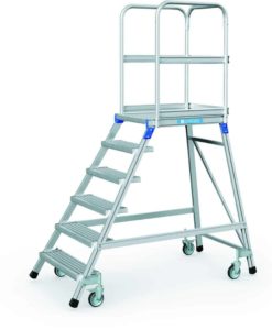 Zarges – Podesttreppe | fahrbar | einseitig begehbar | mit Stahl-Gitterrost-Stufen und Plattform